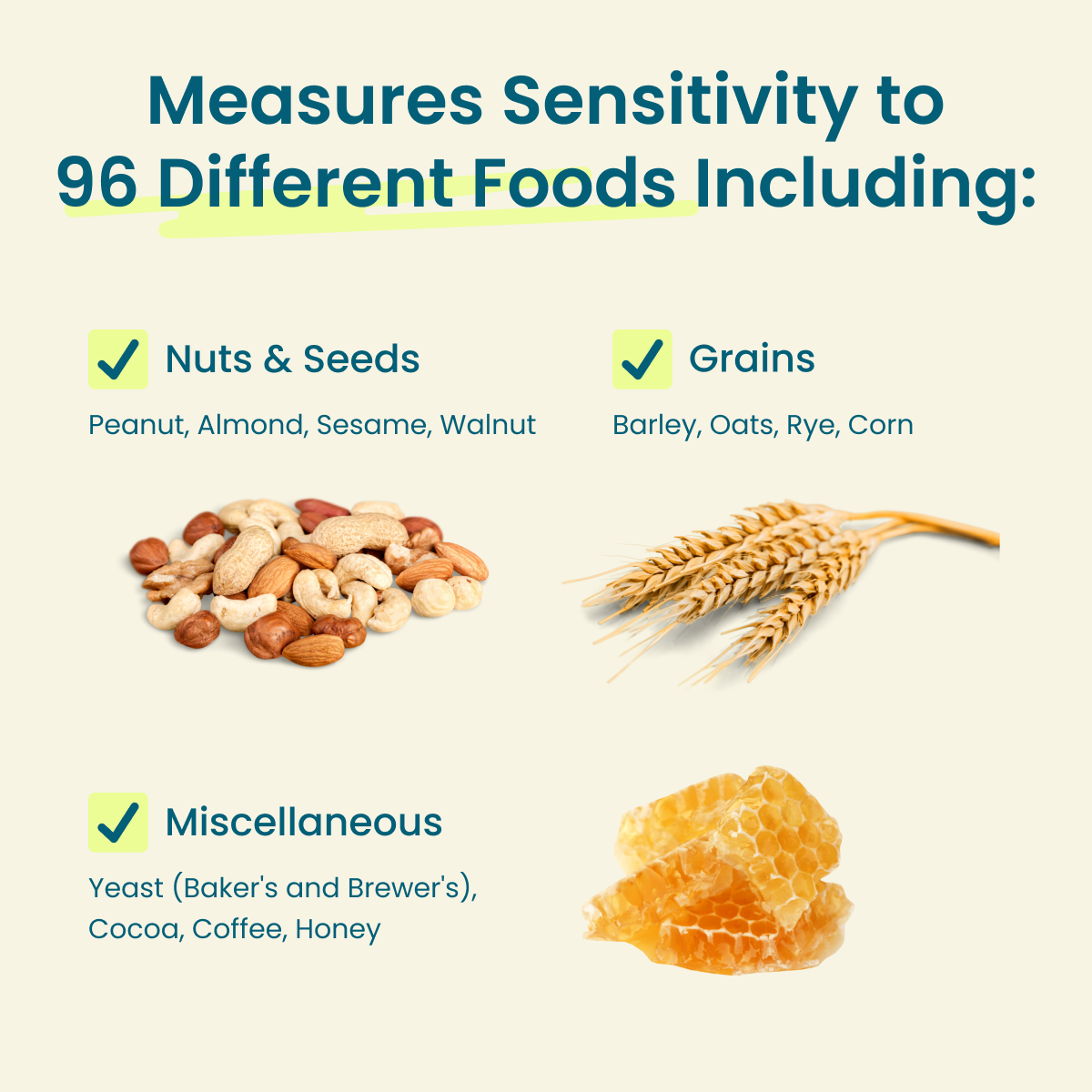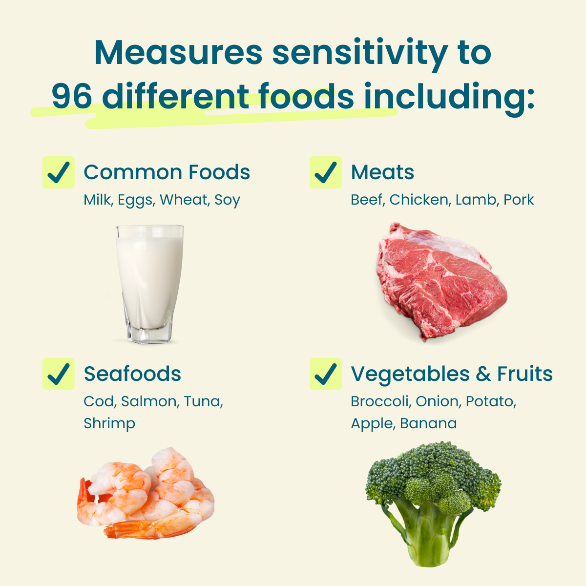 • This test checks for reactions to 96 different foods. Here are some examples: