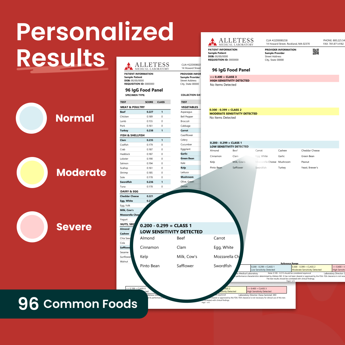 • 96 IgG Food Sensitivity Panel: This test measures delayed reactions (IgG) to 96 commonly eaten foods.