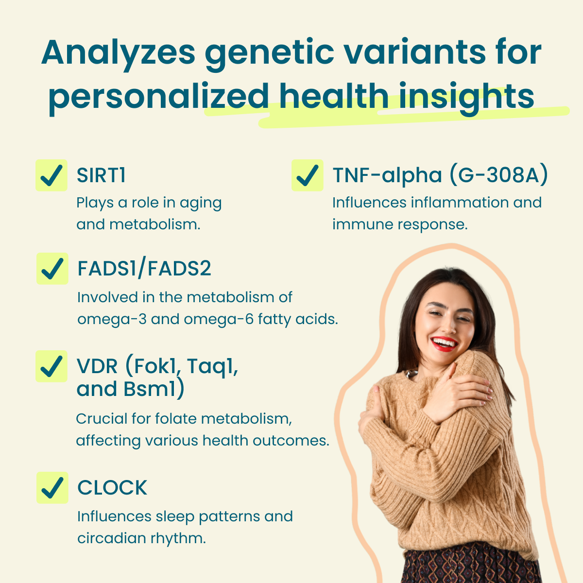 • This test gives you a detailed report about your genes and how they affect your health. It helps you learn about your nutrition, fitness, how to prevent illness, manage weight, reduce stress, and more. This information can help you make better choices to stay healthy.