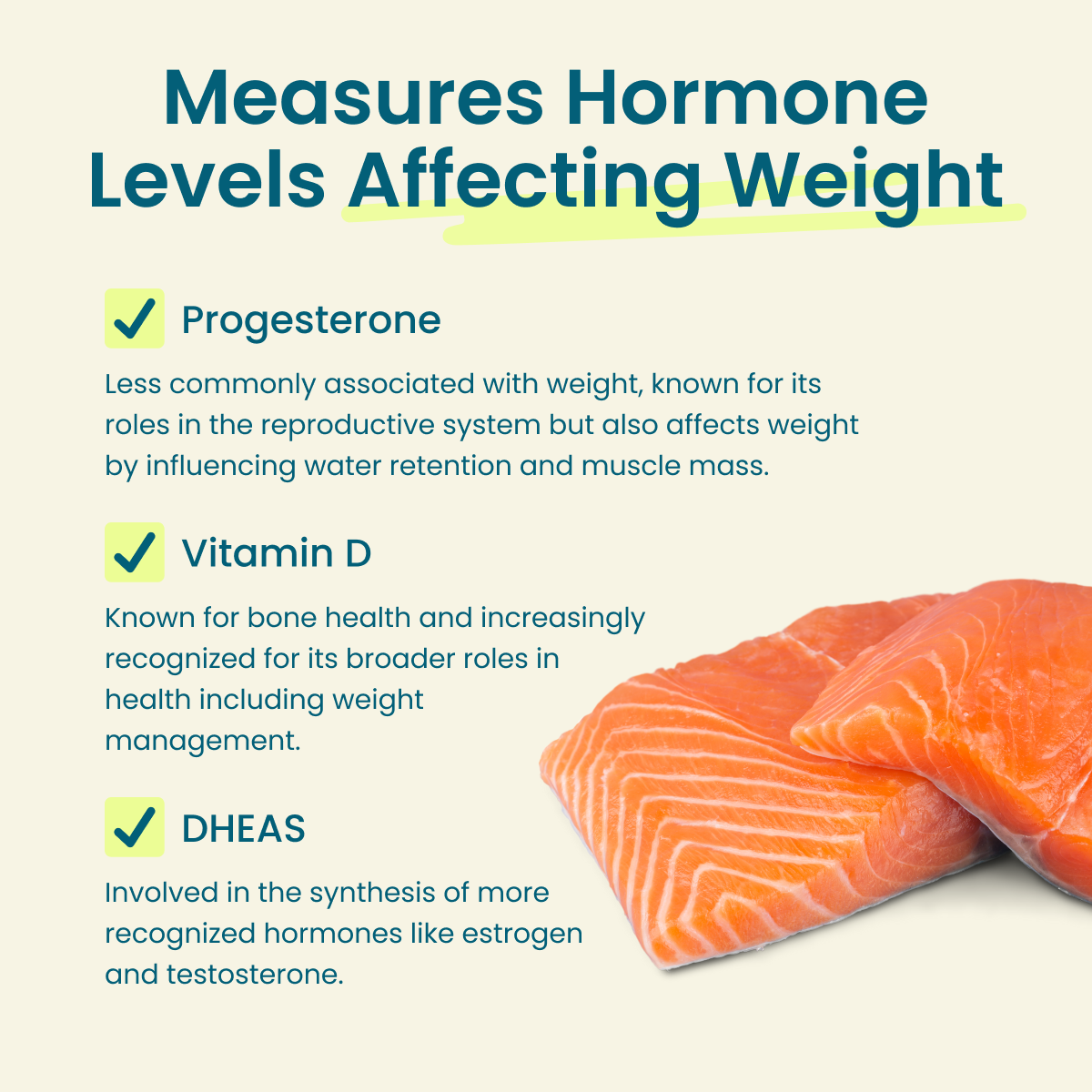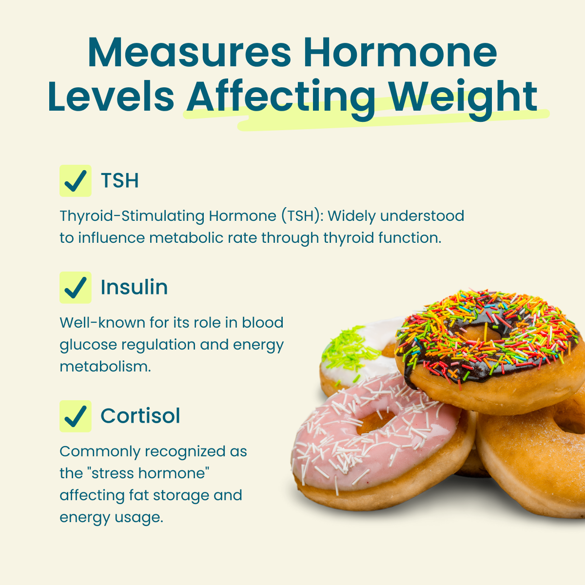 • This test looks at 9 different hormones related to weight gain, including cortisol, DHEA-S, and insulin.